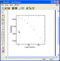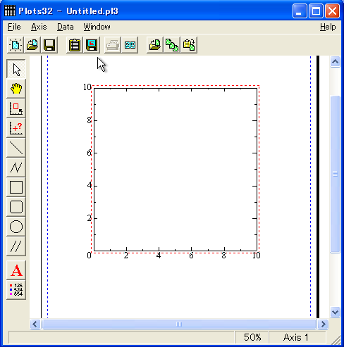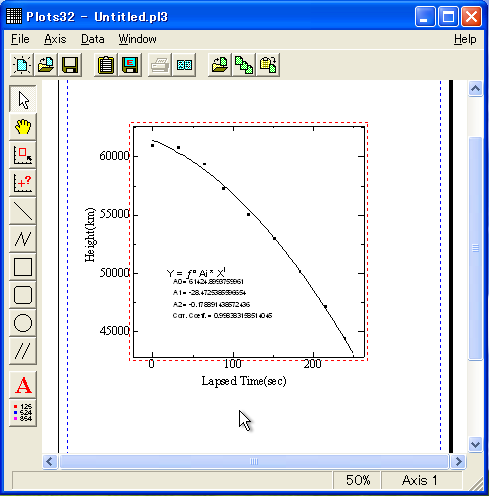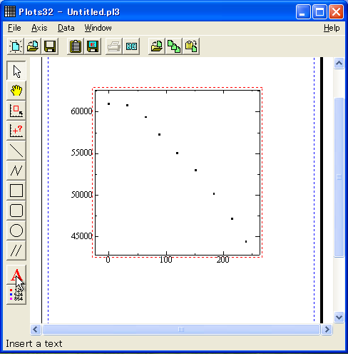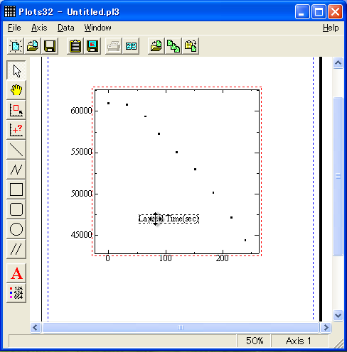 左図のようなグラフが描けます。次にグラフに軸の説明などを書き込んでみましょう。左側に並んだツールにある「A」をクリックします。 |