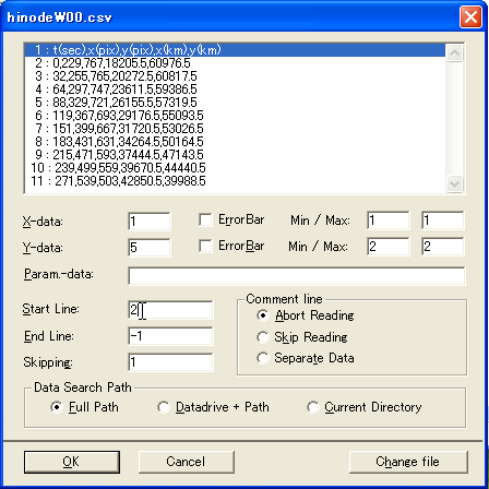 開いたデータの内容が示されます。表示したいグラフは、x座標が1列目の経過時間、y座標が5列目のy(km)ですので、x-dataに1,y-dataに5を入力します。 また、データの1行目はデータの説明があり、データは2行目からですので、StartLineに2を入力します。 |