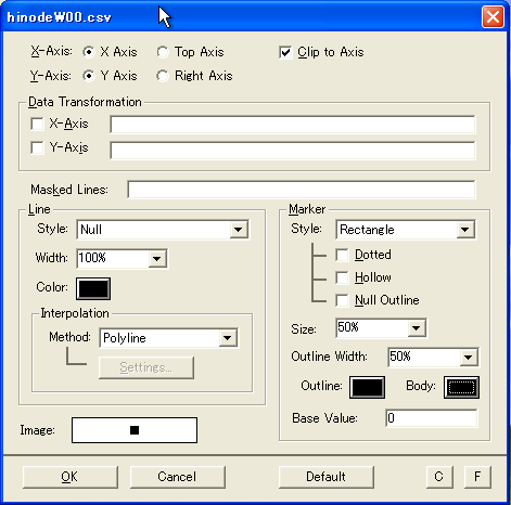 描くグラフのスタイルを決めます。データ間の線は引かず散布図を書きたいので、LineのところのStyleはNullにします。MarkerのStyleにはRectangleを指定します。Sizeは50%、Bodyは黒塗りの四角でデータの点を描いてみましょう。 |