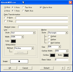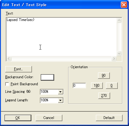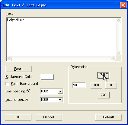 y軸の説明など文字列を縦に表示したい場合は、文字列入力ウィンドウでOrientationのところの「90」ボタンをクリックすると、グラフ上に左回り90度回転した文字列が表示されます。 |