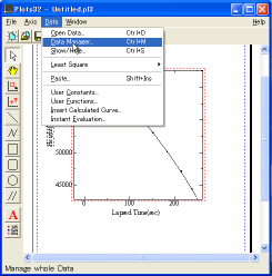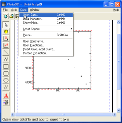 エクセルデータをplot32でグラフに表示するためには、データの保存をcsv形式で行っておく必要があります。 plot32の「Data」->「OpenData」をクリックして、目的のファイルを開きます。 |