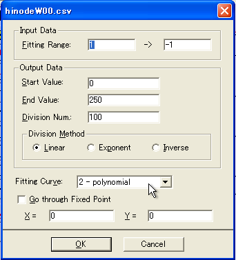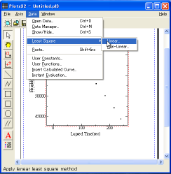 データを近似する関数を求めてみましょう。「Data」->「LeastSquare」->「Linear」をクリックします。 |