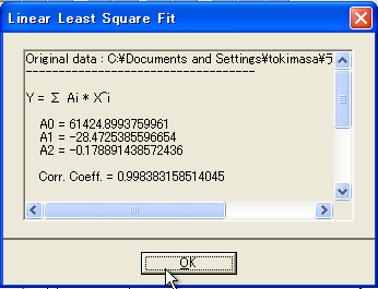 もう一度計算結果が見たいときには、「Data」->「DataManeger」をクリックし、「**L−lsq」で始まるデータを選択して、「Info」ボタンをクリックすると見られます。 現れた画面の結果表示をドラッグしてコピーし、上記説明記入で紹介したテキストツールでテキストボックスへペーストすると、近似関数の係数をグラフに書き込めます。