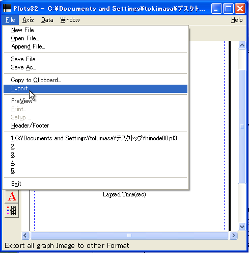 作ったグラフを画像に残すには、メニューの「File」->「Export」をクリックします。 OutputFileにファイル名を記入して「OK」ボタンをクリックすると、グラフが画像として保存されます。保存した画像はビューアなどで見ることができます。 「File」->「CopytoClipboard」にてコピーすると、ペイントなどでペーストすることでも画像保存可能です。